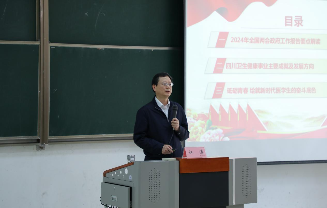 江涛以国家高质量发展创新举措、医疗行业前沿发展动态、社会热点事件为切入点,对2024年政府工作报告进行了深入解读,他着重讲解了积极培育新兴产业和未来产业的重要性以及发展新质生产力是推动高质量发展的内在要求和重要着力点,同时紧密结合卫生健康行业特点,运用大量数据和具体案例,从发展成就、奋斗方向等方面进行生动讲授。教育引导师生深刻领会全国两会精神实质,准确把握核心要义,将学习贯彻全国两会精神融入实际工作和学习中来,加快推进学院各项事业高质量发展。
