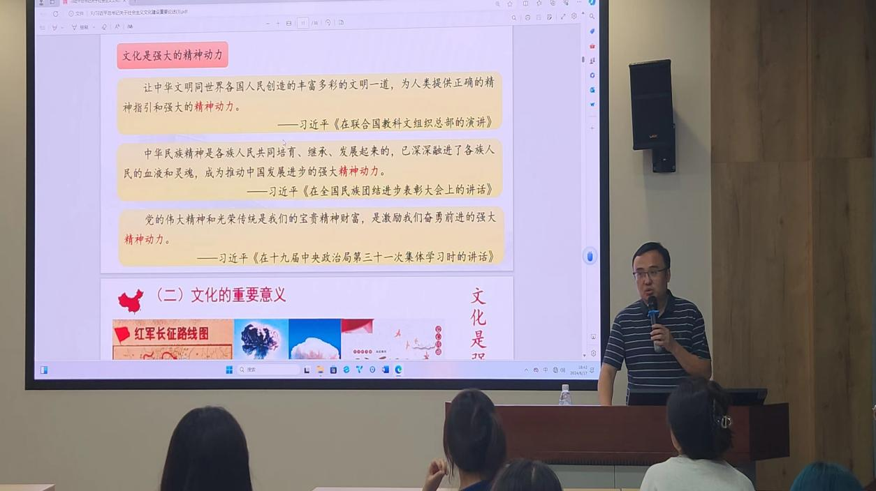 罗小强紧紧围绕学习贯彻习近平文化思想,从文化的重要意义、文化自觉到文化自强、提升文化软实力、大力发展文化产业、提高国民文化素养等方面,深入剖析和解读了习近平总书记关于社会主义文化建设重要论述,社会主义核心价值观的内涵、意义和实践途径,引导同学们深刻领会习近平文化思想的核心要义和精神实质。讲授内容紧密结合当前国家和社会的热点话题,具有很强的针对性和指导性。