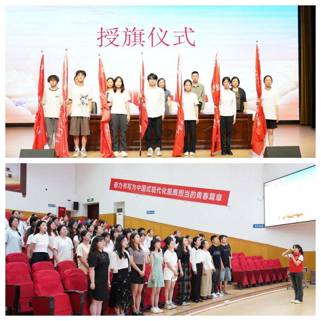 与会领导为学院2024年大学生暑期“三下乡”社会实践服务团授旗。学院青年志愿者协会会长程文馨带领实践队伍宣誓。