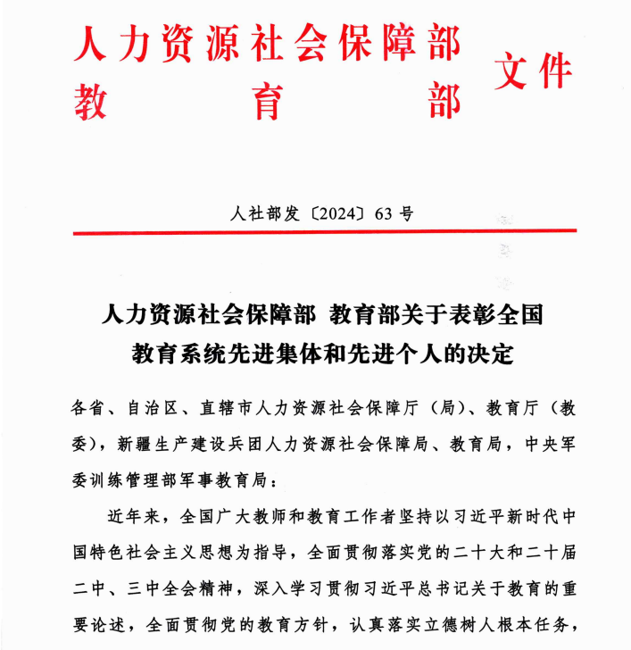 为大力弘扬教育家精神,营造全社会尊师重教浓厚氛围,激励全国广大教师和教育工作者落实立德树人根本任务,近日,人力资源社会保障部、教育部对2024年全国教育系统先进集体和先进个人进行了表彰。学院“格桑花”护理创新团队被授予“全国教育系统先进集体”称号。
