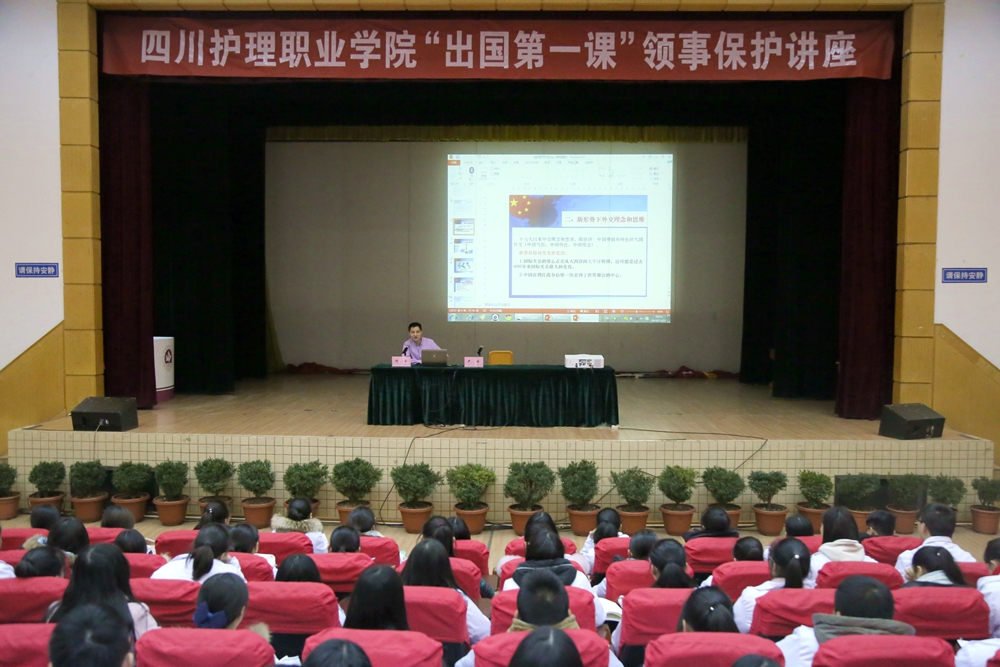 12月28日,成都市人民政府外事侨务办公室领事涉外处副处长胡鑫到校为全校各班学生代表及涉外班级学生开展“领事保护”主题讲座。继续教育部部长李桂英主持讲座。