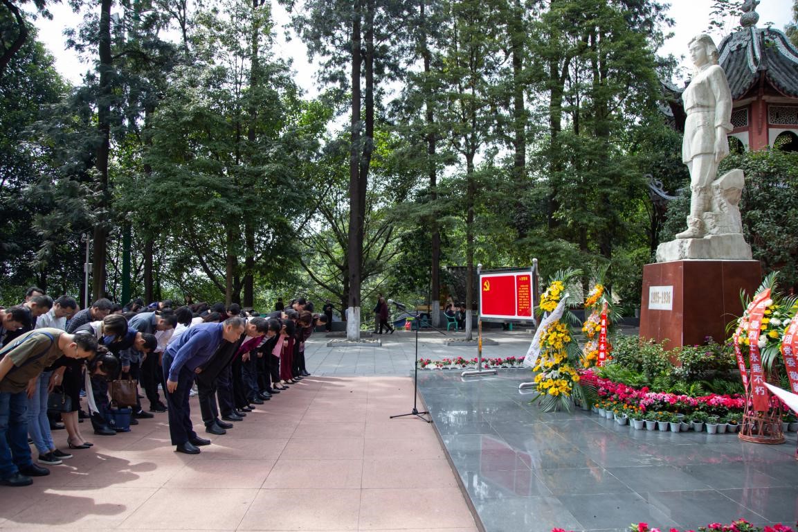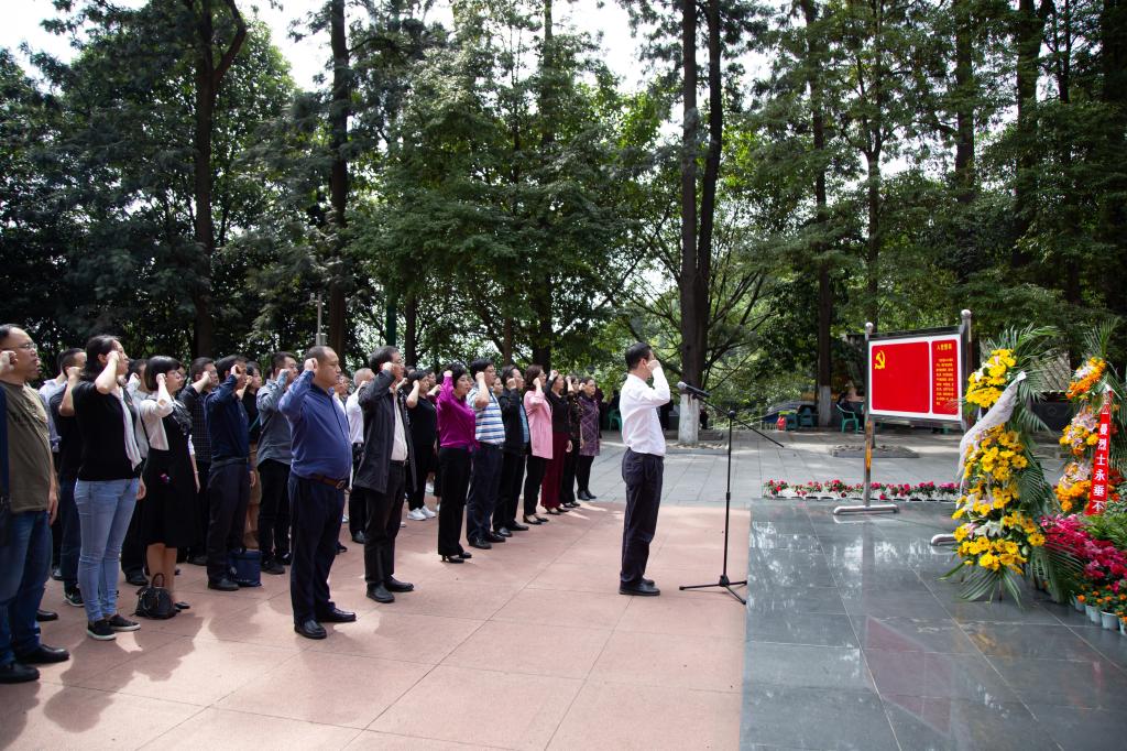 在纪念馆广场赵一曼雕像前,江涛、张先庚带领大家庄严肃立,齐唱国歌。向赵一曼雕像集体鞠躬致敬,缅怀赵一曼同志。随后,江涛带领大家面向党旗,举起右拳,以铿锵有力的声音重温入党誓词。