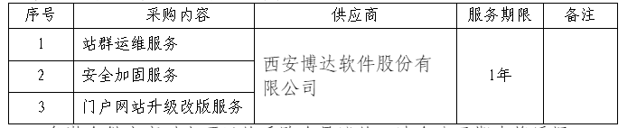 我院于2015年采购了西安博达软件股份有限公司的网站群系统。因西安博达软件股份有限公司提供的免费运维服务已经到期,为了保障学院站群系统运维工作、安全性及业务的持续开展,同时更好地树立我院形象,对外展示学院风采和办学特色,给网站用户提供便捷的服务和良好的视觉感受,经研究决定开展站群运维、安全加固、门户网站改版服务项目建设,项目预算4.98万元,现就此事广泛征求意见。本项目经市场调研,因学院站群系统的开发、运维及系统升级服务均由西安博达软件股份有限公司提供,为保证学院站群系统运维服务的连续性及确保学院站群的安全性,拟采用单一来源采购方式实施采购。具体内容如下:
