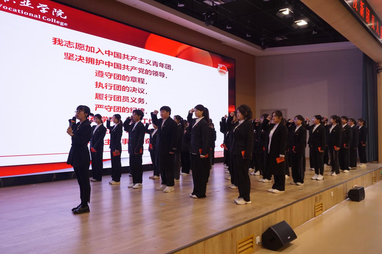 入团仪式在庄严的国歌声中拉开序幕。优秀共青团员代表彭瑞柯宣读新团员名单,黄鸷和田炼分别为新发展团员代表逐一佩戴团徽、颁发团章。全体团员齐声庄严宣誓,铿锵有力的宣誓词在会场内回荡,彰显了新团员们志愿加入中国共青团,为共产主义奋斗的信念与决心。