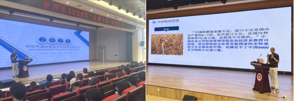 讲座中,赵斌教授以红薯为切入点,系统阐述了转基因食品的基本概念、技术原理及发展现状,并围绕其安全性问题展开专业解读。他结合国内外权威研究数据和典型案例,科学辨析争议,解码安全认知;立足国情,探讨转基因与粮食安全战略;科学回应了公众普遍关注的焦点问题,帮助师生消除认知误区,树立理性科学的观念。