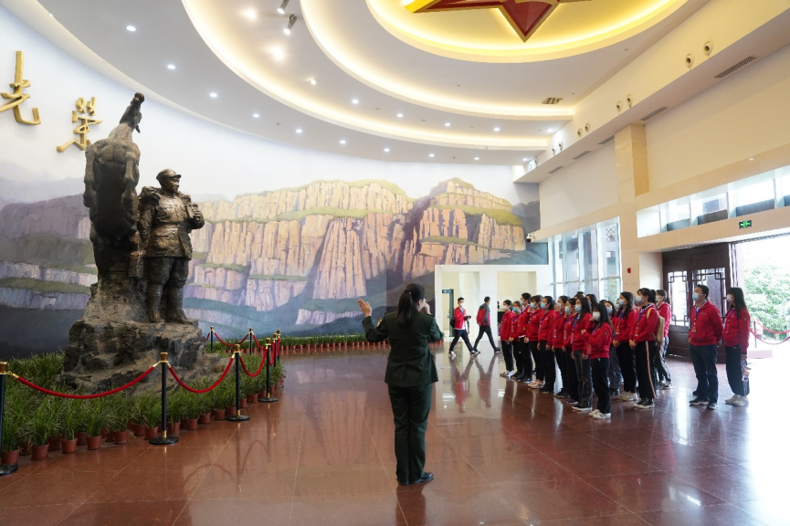 下午,一行人来到塔子山下——红四方面军长征出发地。这里地势险绝,山岩陡峭,嘉陵江由北而南,逶迤而来,波涛拍岸,脚下奔流不息的滔滔江水,似乎一直向人们讲述着那战火纷飞年代的故事。在强渡嘉陵江战役纪念碑前,全体师生认真聆听了红四方面军进入苍溪的革命战争事迹,在红军渡功勋馆中,又深切缅怀了那两万多为革命流血牺牲的烈士,尤其孟氏家族一门忠烈的故事令全体师生动容。在《长征之路 复兴之路图片展》中,师生们了解了红四方面军长征纪实,重温当年红四方面军创建川陕根据地、强渡嘉陵江、挥师长征所经历的曲折战斗历程;深刻感受红军战士坚定的理想信念、浴血奋战的勇气、不怕牺牲的精神。