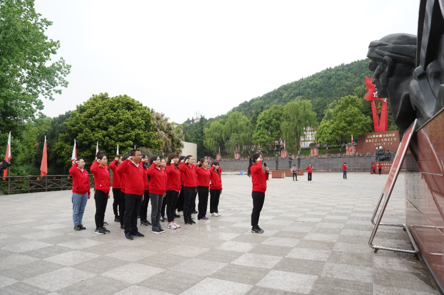 “我志愿加入中国共产党,拥护党的纲领,遵守党的章程,履行党员义务,执行党的决定……”在红军渡塑像前,全体党员举起右拳,面对党旗,重温入党誓词。