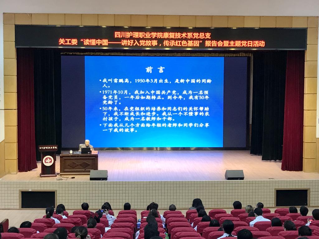 为庆祝中国共产党成立100周年,加强党史学习教育,4月23日,我院康复技术系党总支“读懂中国——讲好入党故事,传承红色基因”报告会暨主题党日活动在学院成都校区举行。本次活动特邀退休老同志、四川省老庄学会副会长雷鹏高作报告。副院长赵斌出席活动,学生代表、党总支全体党员300余人参加学习。