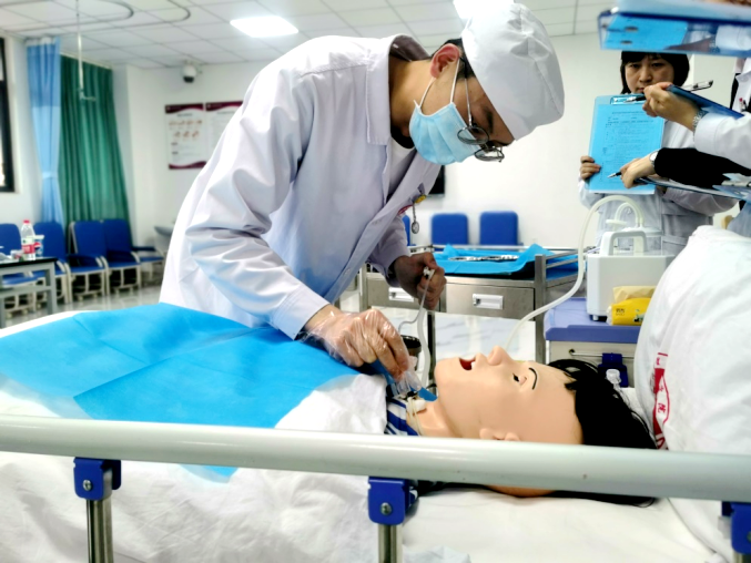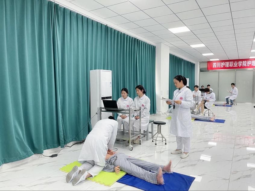 在急救护理技能大赛中,经过前期理论考试及单人心肺复苏项目的选拔,共有9组27名选手进入决赛。选手们根据案例情景,开展心肺复苏抢救。参赛团队操作规范、技能娴熟、团结协作,充分展示了临场应变、急救反应能力。