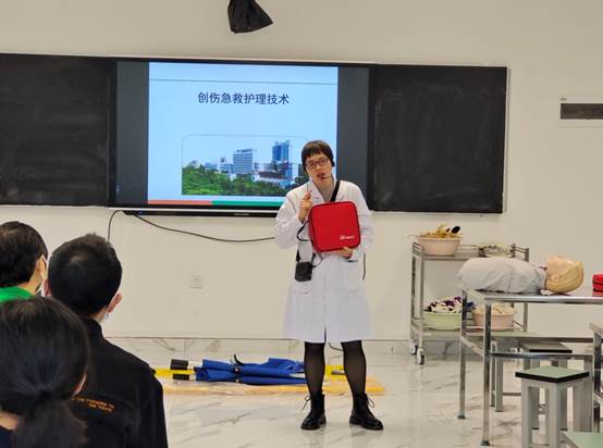 针对创伤现场救护,曾学燕老师详细讲解了创伤止血、包扎、四肢骨折现场固定、转运的主要方式与注意事项,同时重点介绍了心肺复苏的步骤及自动体外除颤器(AED)的使用方法。