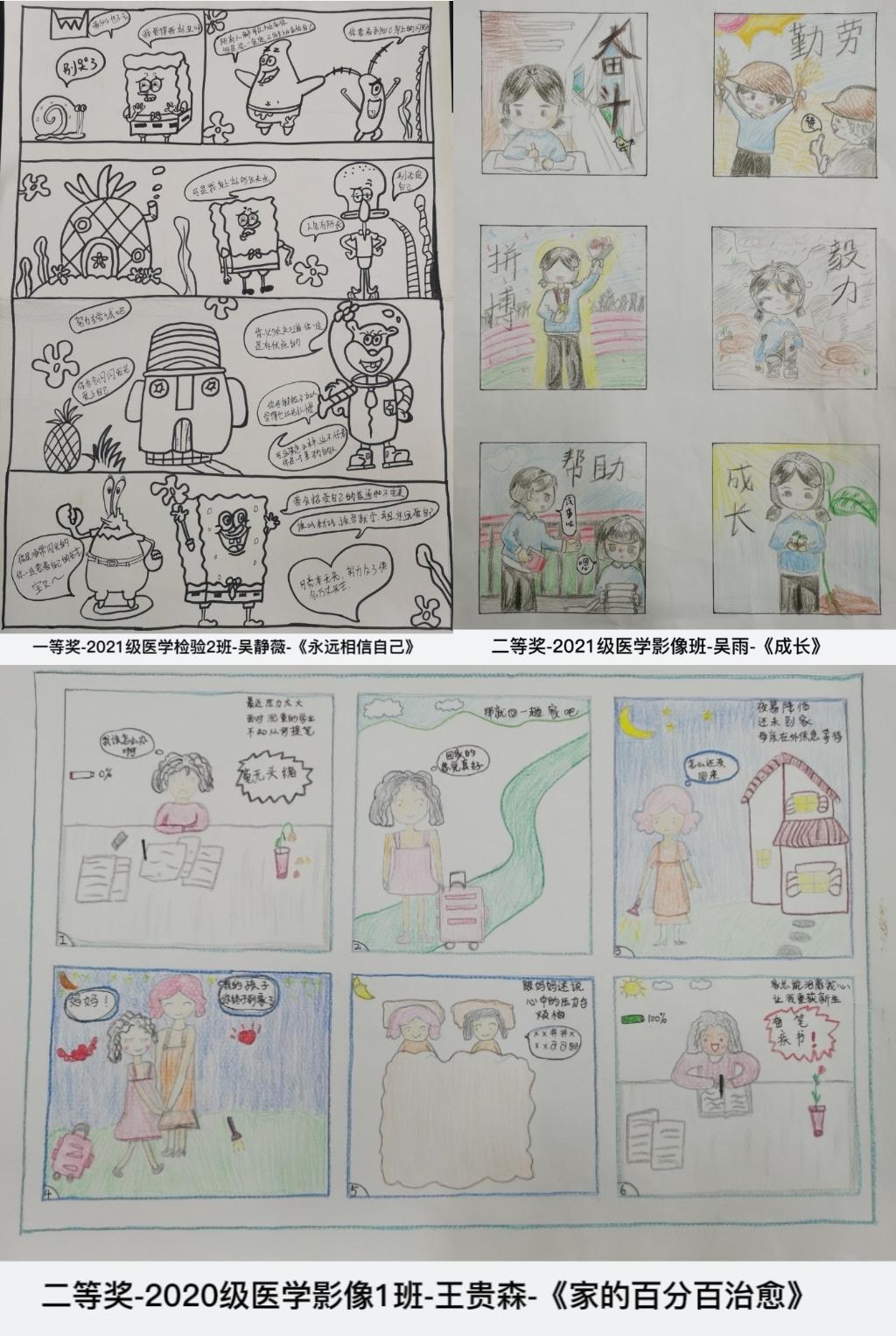 此次比赛在征集初期便得到了广大医技学子的积极响应,收集的作品中有鲜艳的彩色漫画、有笔触细腻的黑白画、有故事性很强的多格漫画,也有图文结合的单幅漫画,形式多样、题材新颖。同学们用画笔描绘心灵,用心灵感受生活,通过漫画的形式与心灵情感的搭配,从而创作出一幅幅各具特色的心理漫画。经过各班学生代表初选、系部老师从作品的主题思想、美学构图等评分标准为维度进行评审,最终评选出一等奖1项、二等奖2项、三等奖3项。获奖作品体现了我系大学生积极向上的精神风貌,如《永远相信自己》《家的百分百治愈》等作品,展现了勇往直前、团结互助、青春活力等积极心理品质。