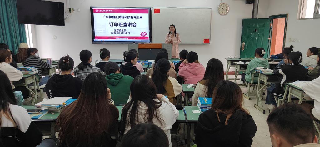 为推进医学美容技术专业与广东伊丽汇美容科技有限公司“定向人才培养培训”项目,11月10日,医疗技术系在成都校区开展“伊丽汇订单班”企业进校宣讲暨面试选拔会,2021级医学美容技术专业全体同学参加。