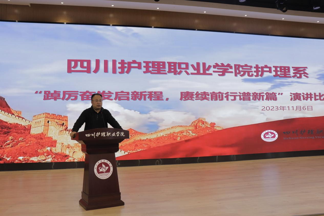 护理系党总支书记黄鸷出席活动并讲话。他指出,此次演讲主题定为“踔厉奋发启新程 赓续前行谱新篇”,希望同学们能够多多关注国家发展,以主人翁的姿态投身社会建设,砥砺强国之志,践行青春担当,在最好的青春年华展现出最美的模样,充分利用好本次演讲比赛平台,锻炼自我、赛出风采。