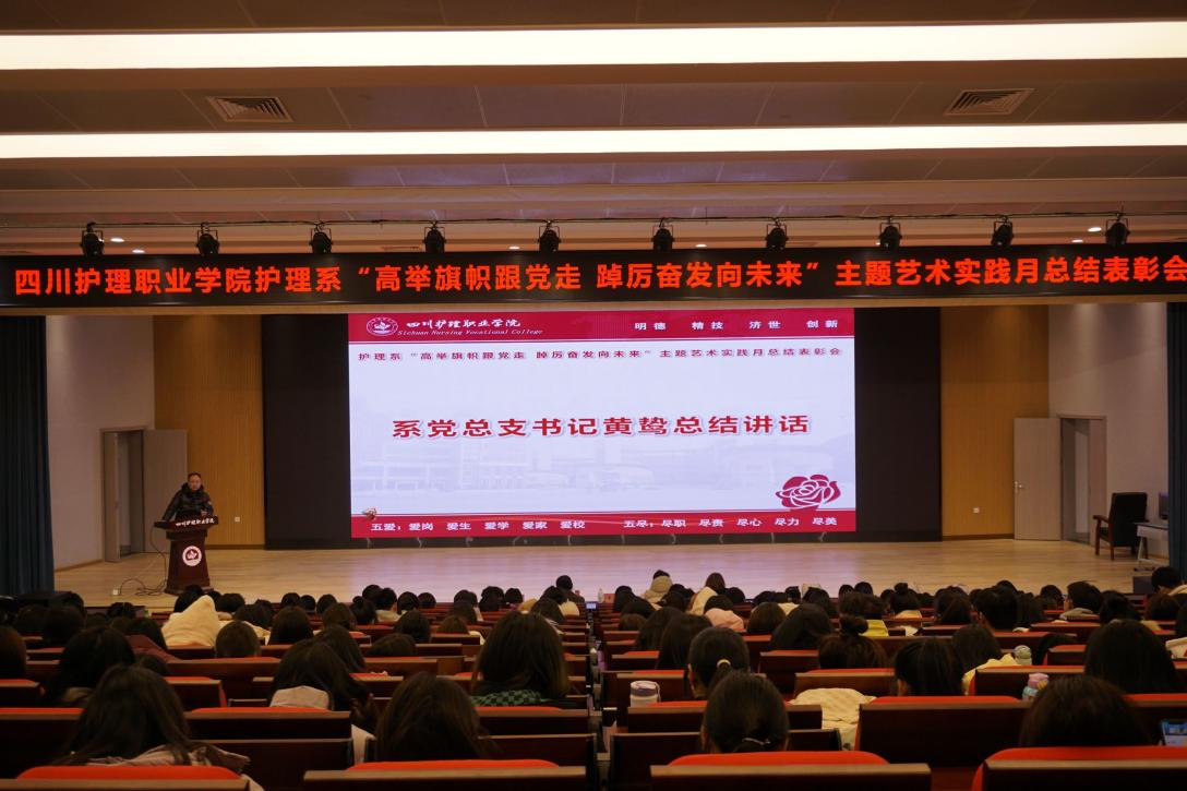 为深入学习贯彻习近平新时代中国特色社会主义思想,扎实推动团员和青年主题教育走深走实。护理系于12月21日在德阳校区举办“高举旗帜跟党走 踔厉奋发向未来”主题艺术实践月总结表彰会。系党总支书记黄鸷、副书记田炼出席会议,全体学工管理老师、部分参赛学生共400余人参加。
