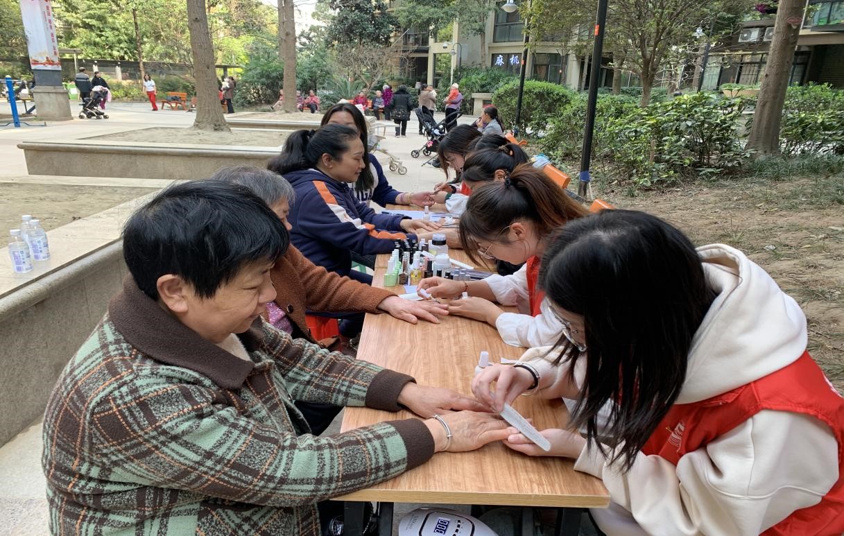 科普服务现场,影像教研室两名老师为居民解读健康检测报告,指导健康生活方式。医学美容技术专业学生自主创业店—怡美美容工作室成员为居民提供美甲体验服务,让美丽走进社区,走进居民生活。