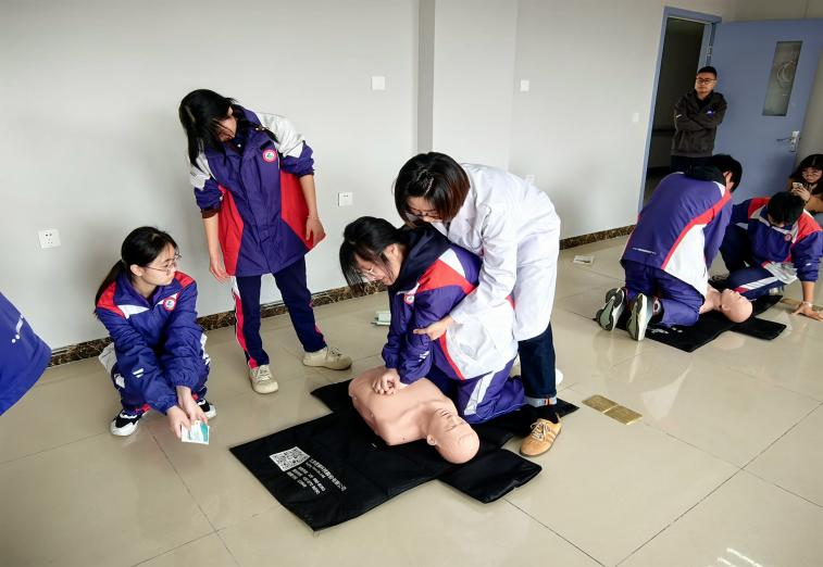 全科教研室教师为同学们普及急救黄金时间概念和急救技能,包括心肺复苏、AED的基本操作步骤、要领和注意事项,以及海姆立克急救法的完整操作,临床实训中心教师耐心细致示范急救操作方法。宣讲后,老师们分组带领同学们利用模拟人进行实操练习,一对一纠正同学们实操动作。参与学习的同学们纷纷感慨急救技能很实用,在遇到紧急情况时,能迅速开展有效自救或互救,尽可能争取黄金抢救时间。