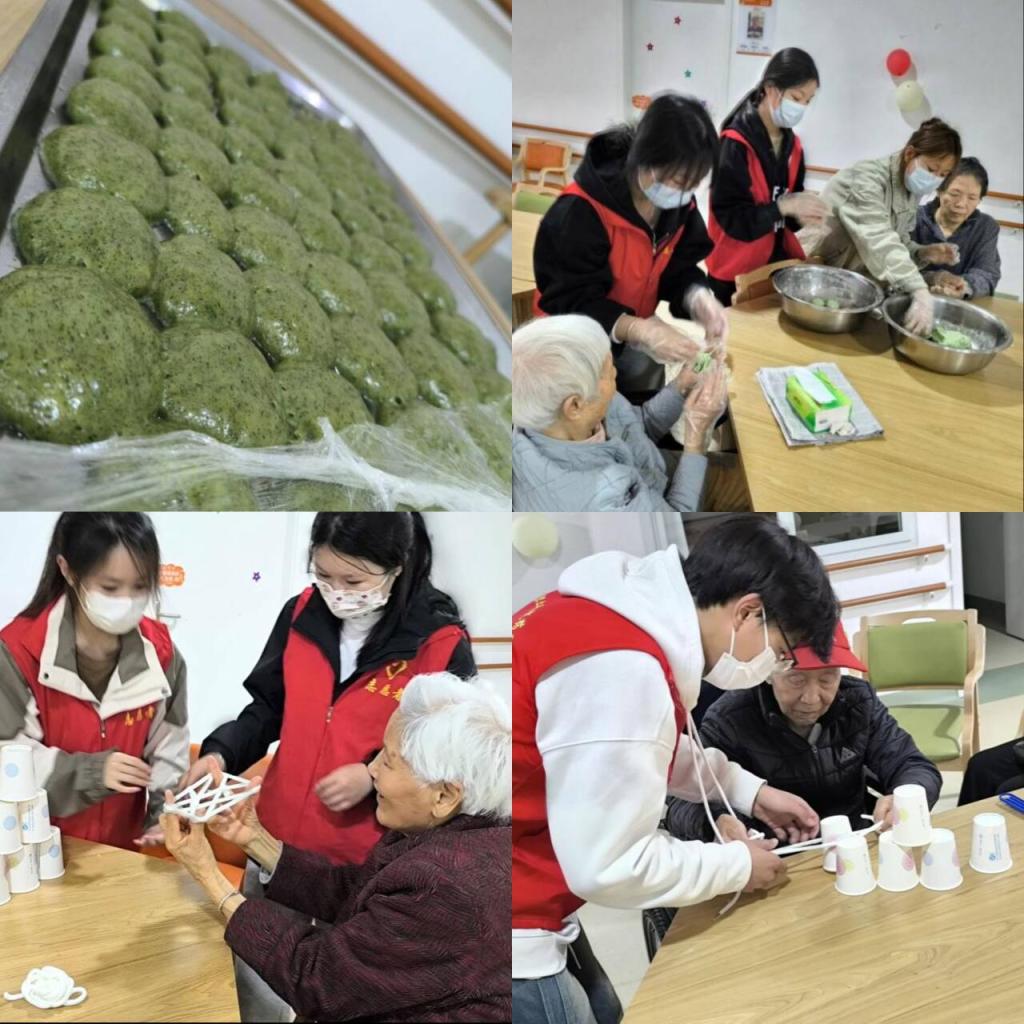 志愿者和德阳锦欣护理中心老人和护理人员暖心互动,一起包青团,交流清明节吃青团习俗的来历和寓意。志愿者陪伴老人一起聊天,一起怀念过往人生经历,重温清明节文化习俗。除此之外,志愿者还与老人一起做手工,玩游戏,组织文艺表演,大家乐在其中。
