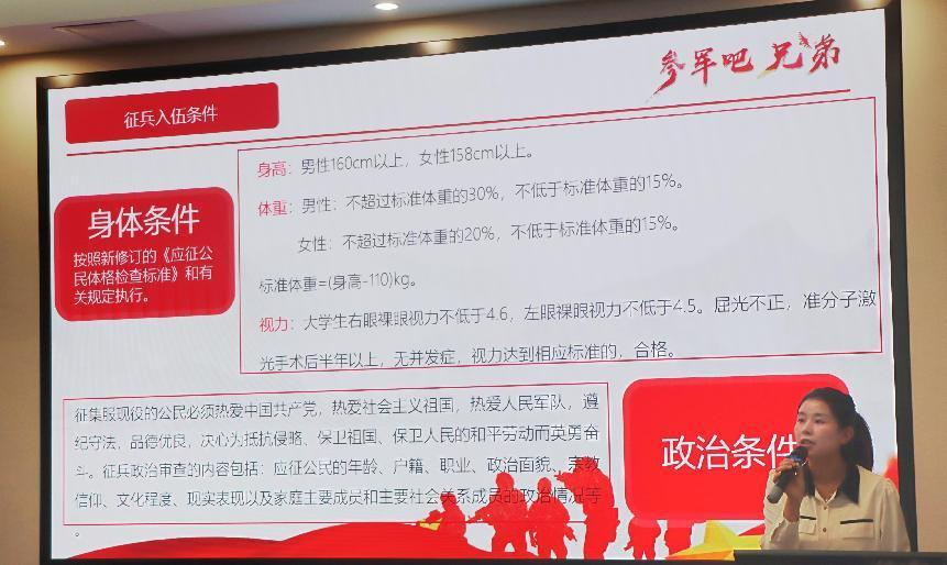 宣传会上,药学系退役复学大学生代表何俊杰、洛绒尼马分享入伍经历、成长锻炼与收获,鼓励同学们应征入伍,到祖国需要的地方去,献身国防事业,绽放青春风采。辅导员苟爱菊讲述了自身参军初心,围绕同学们关心的大学生参军入伍条件、报名流程、享有的优待权益等各类政策进行详细讲解。她鼓励更多有志青年,践行爱国情怀,积极履行社会责任,参军报国、不负韶华。