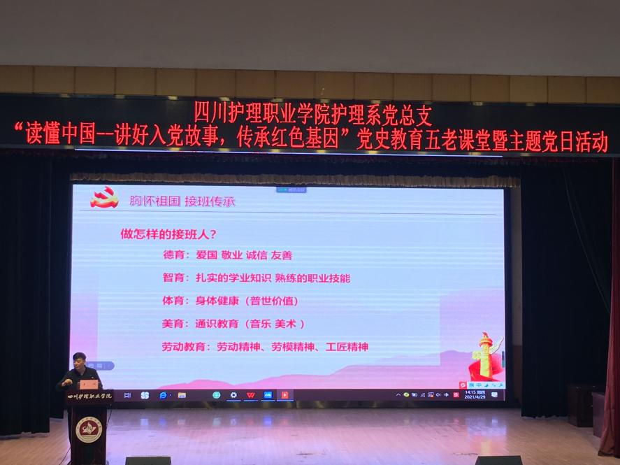 为庆祝中国共产党成立100周年,加强党史学习教育,2021年4月29日,护理系党总支在成都校区举行“读懂中国--讲好入党故事,传承红色基因”“五老”讲党史主题党日活动。本次活动特邀学院退休教师王澜同志做专题讲座。