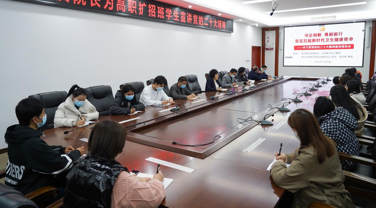 为深入学习贯彻党的二十大精神,培养学生爱党爱国情怀,11月30日,教育部全国高校学习宣传党的二十大精神师生巡讲团成员、学院党委副书记、院长张先庚教授以《守正创新 勇毅前行 坚定扛起新时代卫生健康使命》为题,通过线上线下方式,为300余名高职扩招班学生宣讲党的二十大精神。