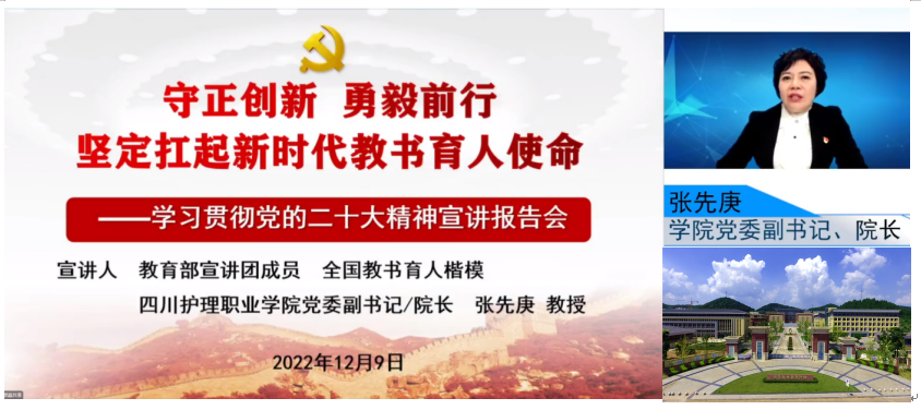为深入学习宣传贯彻党的二十大精神,不断汇聚奋进新征程、建功新时代的强大力量,12月9日,全国高校学习宣传党的二十大精神师生巡讲团成员、全国教书育人楷模、第七届全国黄炎培职业教育杰出校长、学院党委副书记、院长张先庚教授为全校师生线上作了题为《守正创新 勇毅前行 坚定扛起新时代教书育人使命》的党的二十大精神宣讲,共1.2万人次师生观看。