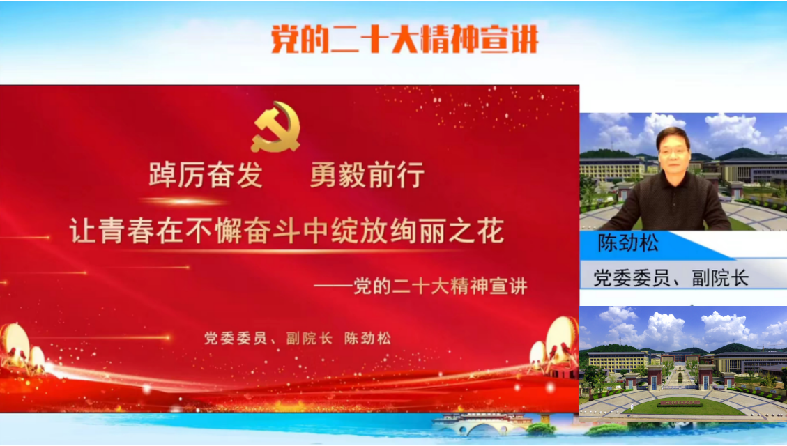 为深入学习宣传贯彻党的二十大精神,引导广大青年学生听党话、跟党走,12月15日,学院党委委员、副院长院长陈劲松为全校青年学生干部作了题为《踔厉奋发 勇毅前行 让青春在不懈奋斗中绽放绚丽之花》的专题宣讲,院系学生干部、班级班委等共计3000余人次线上听讲。