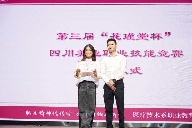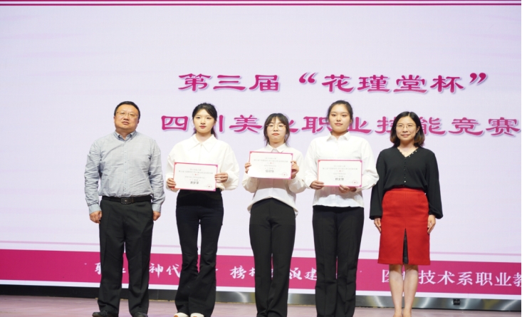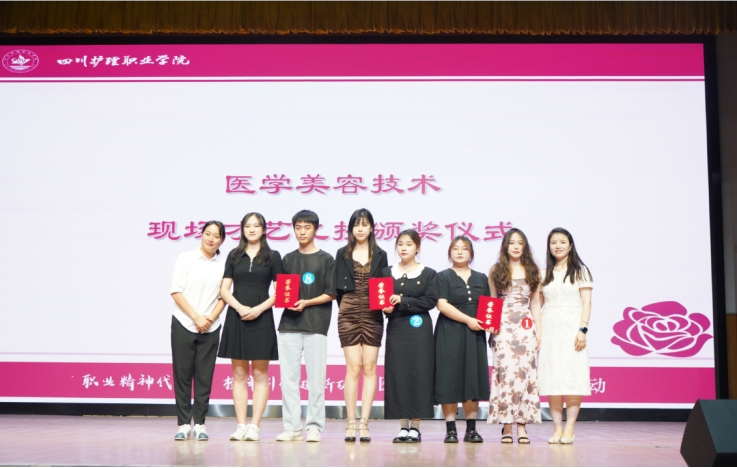 第三部分,专家、系部领导为获得专业校赛、行业省赛的同学颁发荣誉证书。现场掌声不断,优秀榜样的示范引领,激发同学们拼搏奋进。活动第二现场,医学美容专业学生开展了人物妆造比拼活动。最后,活动在合唱《我和我的祖国》中圆满落幕。
