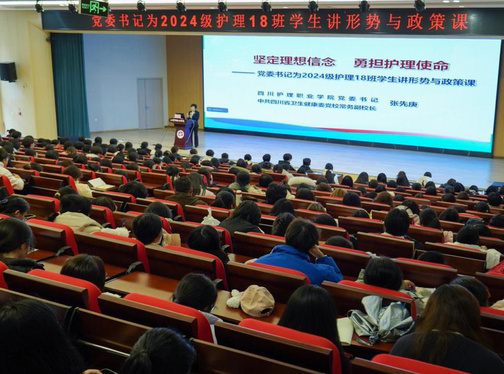 12月11日,全国教书育人楷模、学院党委书记张先庚走进2024级护理大专18班,以“坚定理想信念,勇担护理使命”为主题,紧扣时代脉搏,深入浅出地为同学们讲授了一堂生动丰富、兼具思想高度、专业深度与实践温度的形势与政策课。